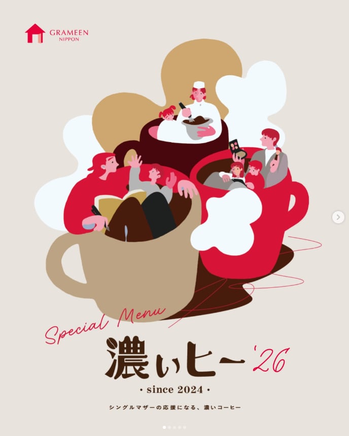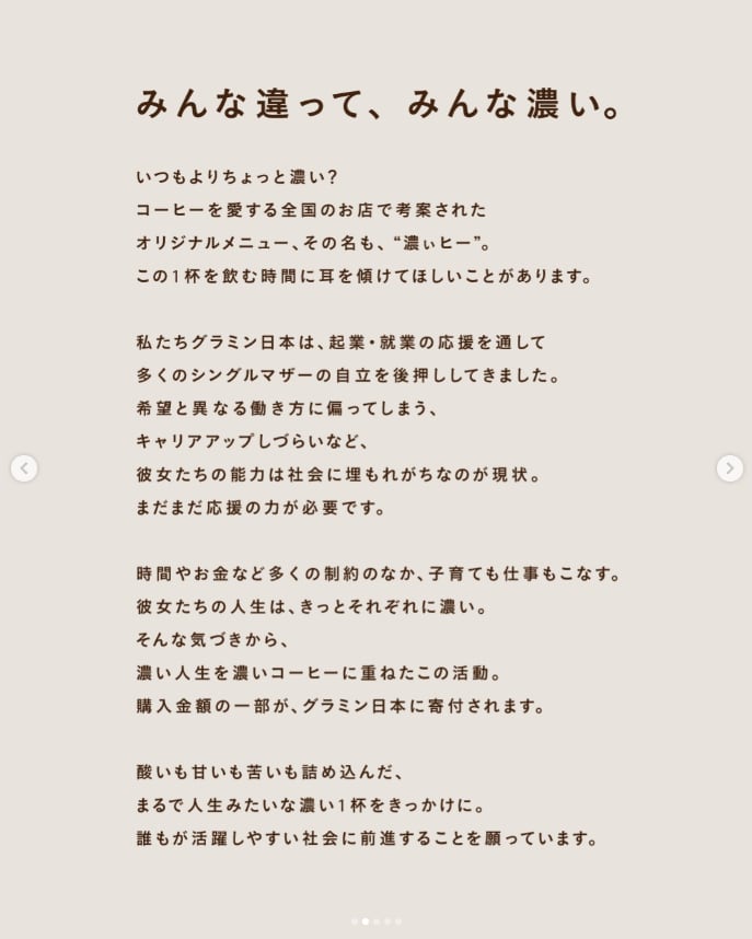 *このセットは購入金額の3%が「グラミン日本」への募金として、シングルマザーの起業・就業を応援する活動の寄付へつながる特別なコーヒーです。時間やお金など多くの制約のなか、子育てや仕事など様々なチャレンジをする彼女たちの人生は、きっとそれぞれに濃い。そんな気づきから、それぞれの濃い人生を濃いコーヒーに重ねたチャリティプロジェクトを立ち上げました。コーヒーを愛する日本全国のお店が思い思いに「濃いコーヒー」を考案し販売します。